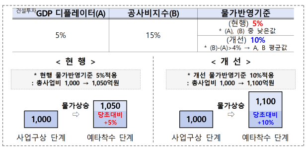 이에 정부는 물가반영기준을 개선해 비용 상승분이 총사업비에 최대한 반영될 수 있도록 지침을 개선할 계획인데요. 앞으로는 건설투자 GDP 디플레이터를 적용하되, 공사비지수와의 격차가 4%를 초과할 경우 GDP 디플레이터와 공사비지수의 평균값이 적용될 것으로 에상됩니다.