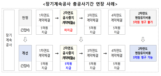 이외에도 장기계속공사 중 국가책임으로 발생한 공백기간에 지출한 인건비 및 임대료 등 현장유지비용을 국가가 보상하도록 하는 법적 근거도 마련될 것으로 보입니다. |