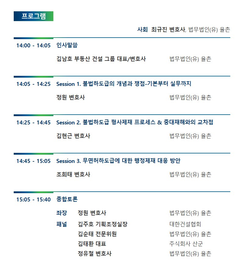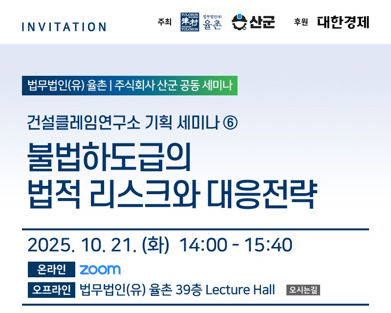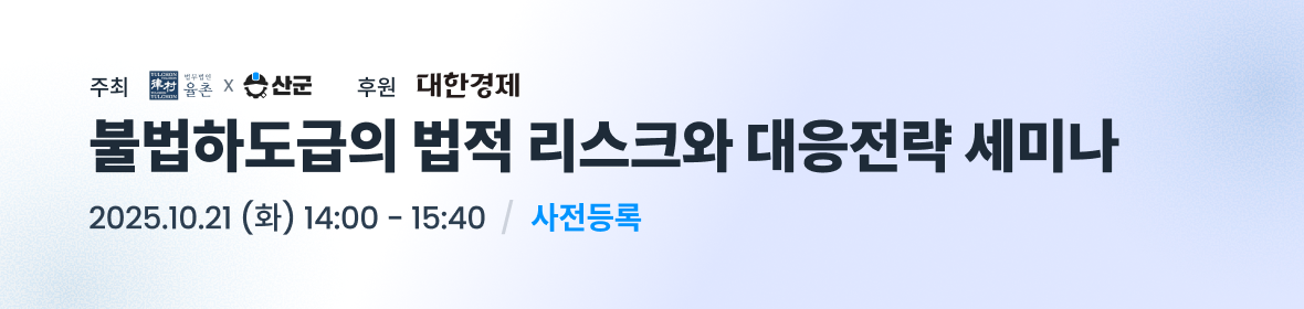 법무법인(유) 율촌과 주식회사 산군이'불법하도급의 법적 리스크와 대응전략' 세미나를 개최합니다.