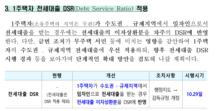 이외에도 유주택자가 수도권·규제지역에 전세대출을 받는 경우에도 DSR을 적용해 전세대출의 이자상환분을 차주의 DSR에 반영하는 조치도 실행됩니다. |