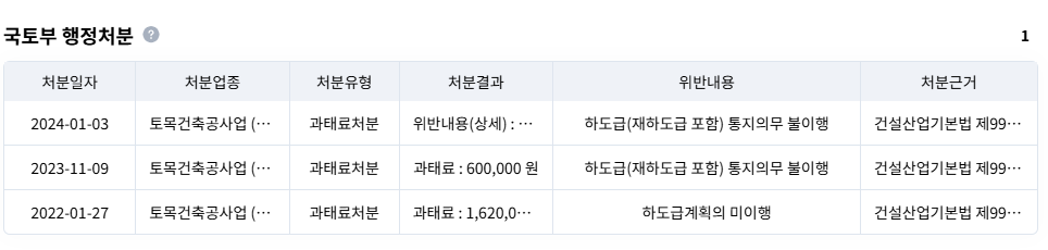 | 특정 건설사의 불법하도급 관련 행정처분 내역을 확인할 수 있다. (출처: 산업의역군 기업DB) |