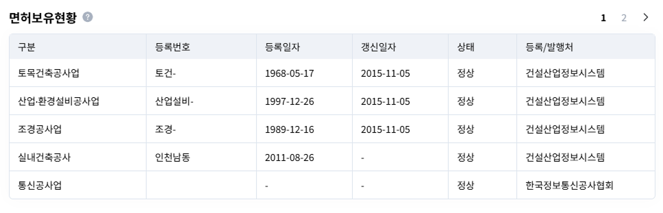 | 특정 건설사가 보유 중인 면허 현황을 확인할 수 있다. (출처: 산업의역군 기업DB) |