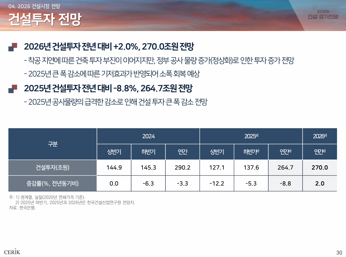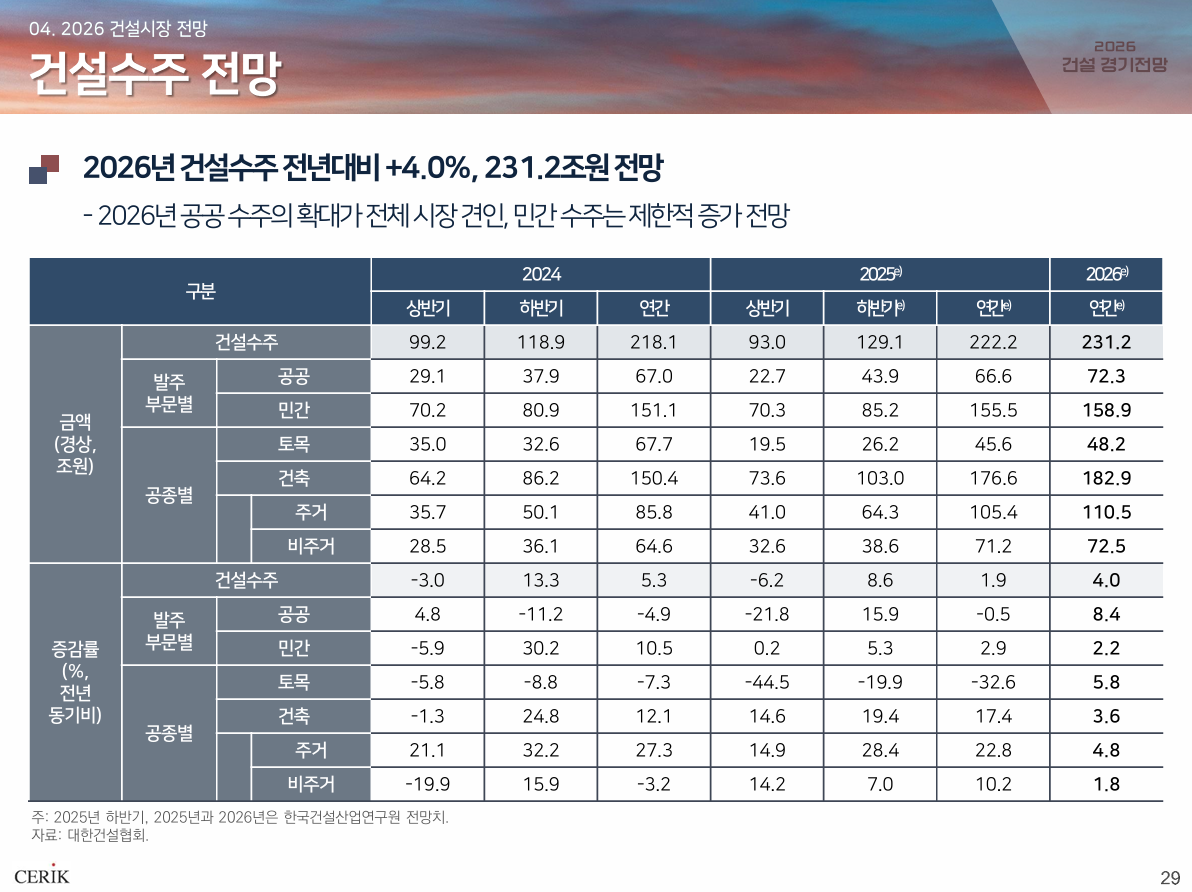 이는 최근 3년간 건설경기 침체를 유도한 부정 요인들이 남아있는 상황이지만, 공공 수주 확대가 전반적인 건설 수주를 견인할 것이란 판단에서 나온 전망인데요. 확장 재정 기조 속 2026년 SOC 예산이 전년 대비 7.9% 상승한 27.5조 원까지 늘어났고, 또한 정부가 건설경기 회복과 주택공급 안정을 위해 노력하고 있는 점 등이 시장에 긍정적으로 작용할 것으로 내다보고 있는 겁니다.