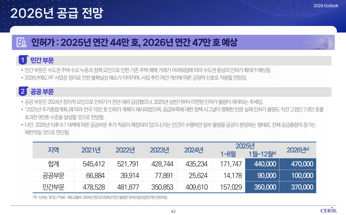 건산연은 2026년 인허가 물량은 연간 47만 호에 달할 것이라 전망했는데요. 민간부문의 경우, 수도권 주택 수요 누증, 6·27, 10·15 부동산 대책으로 기존 주택 매매가 어려워짐에 따라 수도권을 중심으로 인허가가 확대될 것이라 예상했습니다.