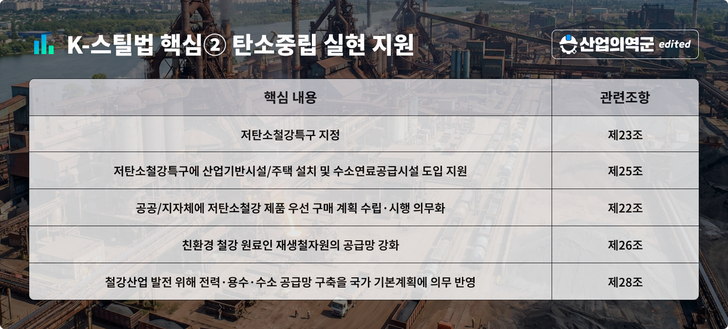 K- 스틸법은 지난 1986년 철가공업육성법이 폐지된 이후 약 40년 만에 의결된 철강산업을 위한 단독 법률인데요. 제1조에 철강산업의 지속가능한 성장기반을 구축함으로써 국가경제안보 및 국민경제의 발전에 이바지함을 목적으로 한다고 명시한 대로 철강산업 발전에 집중하기 위한 정책들이 담겼습니다.
