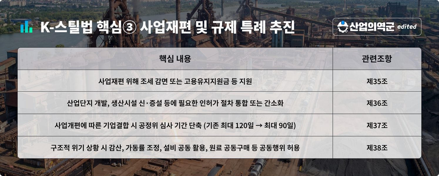 하이라이트는 공동행위에 관한 특례를 명문화한 제38조입니다. 이 조항은 철강산업이 구조적 위기에 처했을 경우, 설비 가동률 조정·생산량 감축 또는 감산에 관한 협의 및 품목별 생산량 및 출하 시기 조정 등 수급 안정화에 필요한 협의를 공정거래법상 담합 예외로 인정한다는 내용을 담고 있는데요. 이로써 공급 과잉 및 수익성 악화 등 위기 상황에서 과도한 저가 공급이나 무리한 공급 확대를 억제할 수 있는 제도적 장치가 마련된 셈입니다. |