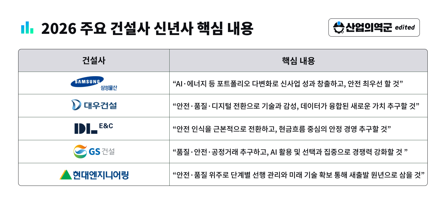 시장을 주도하는 국내 대표 건설사들의 신년사는 당해 건설업계의 핵심 흐름을 나타낸다고 봐도 무방한데요. 금주 산군인사이트에서는 국내 주요 대형 건설사 CEO들의 신년사를 토대로, 각 건설사의 2026년 경영 방침을 살펴보겠습니다.